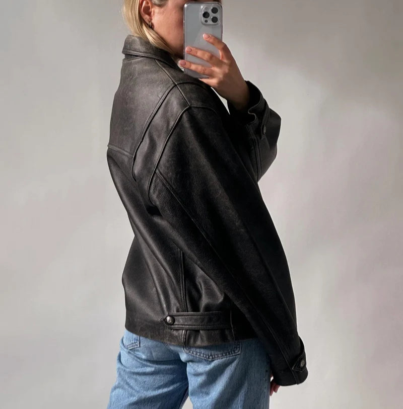 This vintage-style black leather bomber jacket is the perfect outerwear piece for any occasion. Pair it with jeans and boots for a casual chic look, or throw it over a dress for an edgy yet sophisticated vibe. Whether you're heading to a night out, a casual coffee date, or a weekend adventure, this jacket enhances your look effortlessly.
