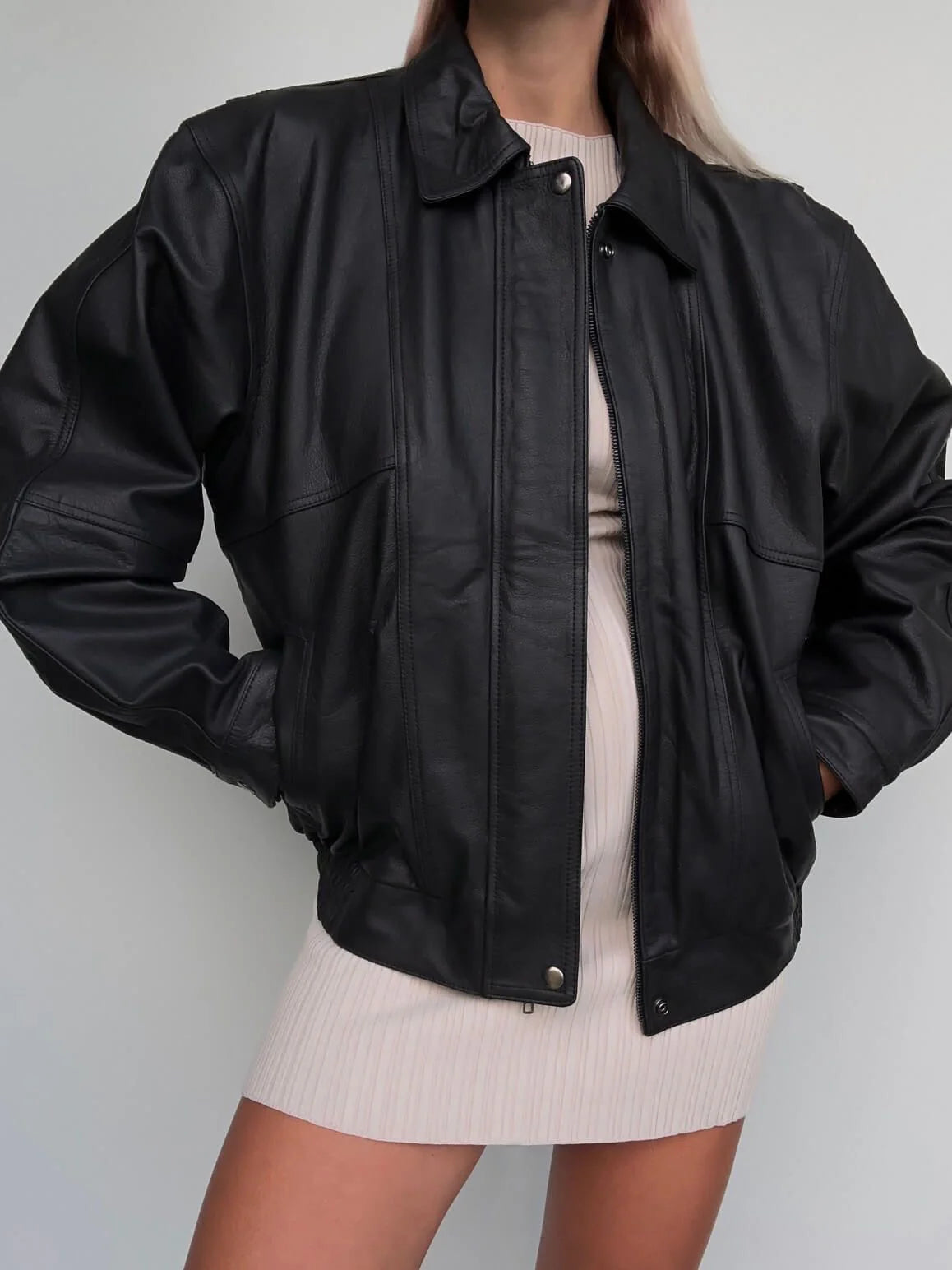 This vintage-style black leather bomber jacket is the perfect outerwear piece for any occasion. Pair it with jeans and boots for a casual chic look, or throw it over a dress for an edgy yet sophisticated vibe. Whether you're heading to a night out, a casual coffee date, or a weekend adventure, this jacket enhances your look effortlessly.